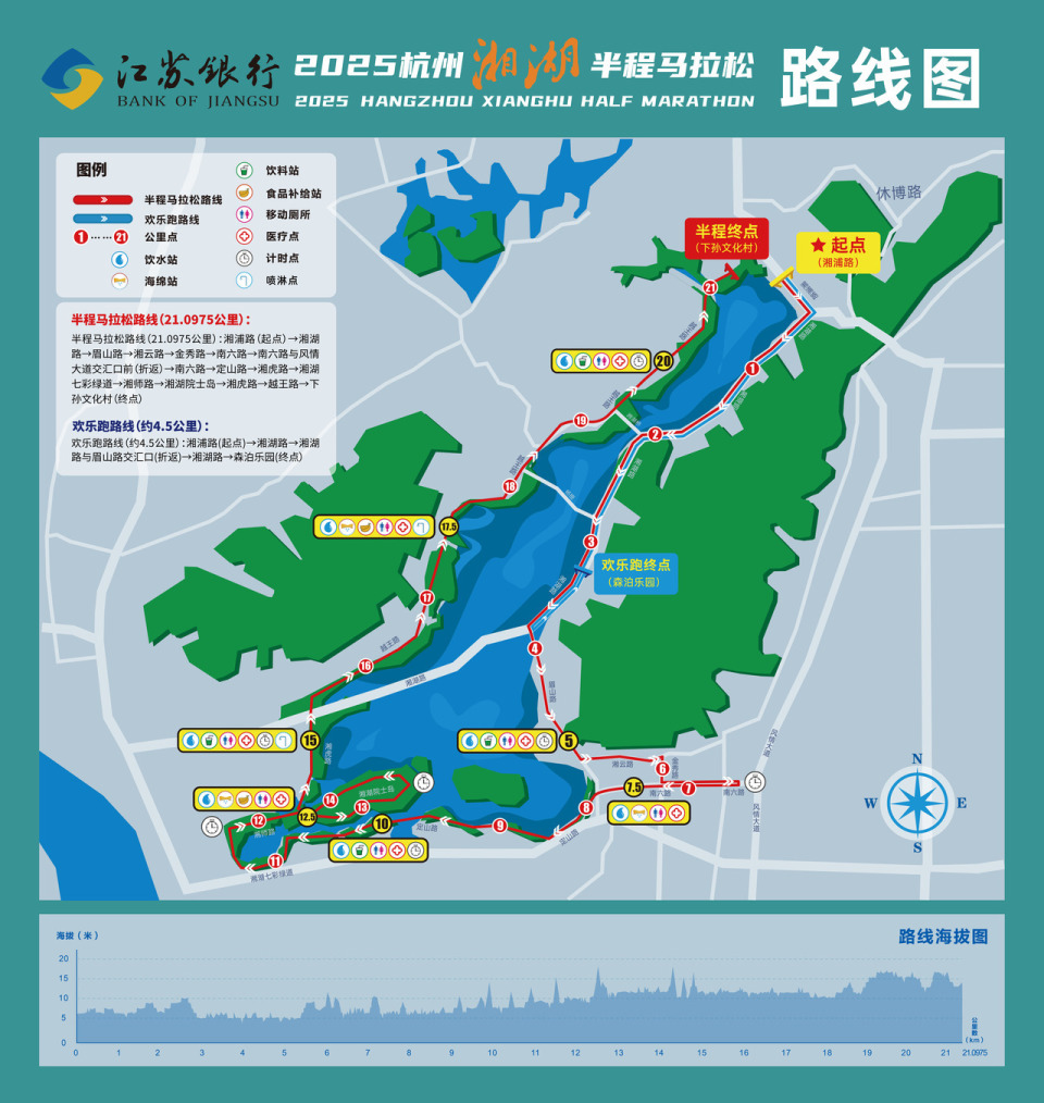 本次“湘马”起点为湘浦路,选手将沿湘湖奔跑,途经湘浦观鱼、跨湖桥遗址博物馆、湘湖·雅韵公园、湘湖金融镇慢生活街区、花海香田、定山广场、老虎洞游客中心、湘湖越界X-LIVIN、荷花庄、城山广场、下孙文化村等湘湖标志性景点,尽览湘湖风情。半程马拉松终点设在下孙文化村,欢乐跑终点设在森泊乐园。